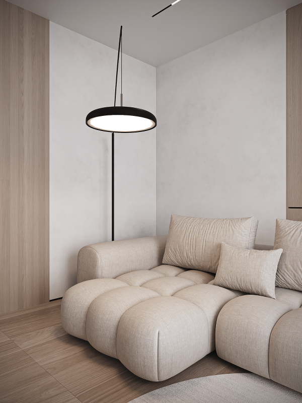 Sculptural pendant lights shape softly organic forms above a modular sofa and two round coffee tables.