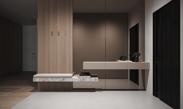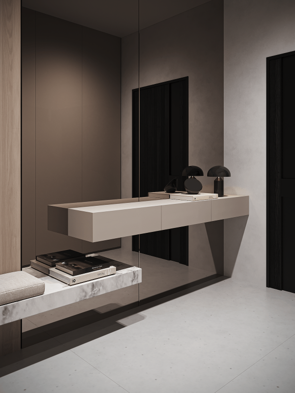 A floating bench adds a cool slice of white marble to the mix. A black front door makes a bold statement in the narrow hallway, complemented by a black mushroom table lamp. Opposite, custom-built storage units complete the entrance hall with warm gray panel doors. The floor-to-ceiling fit creates slots of concealed space for bulky jackets and outdoor kit.