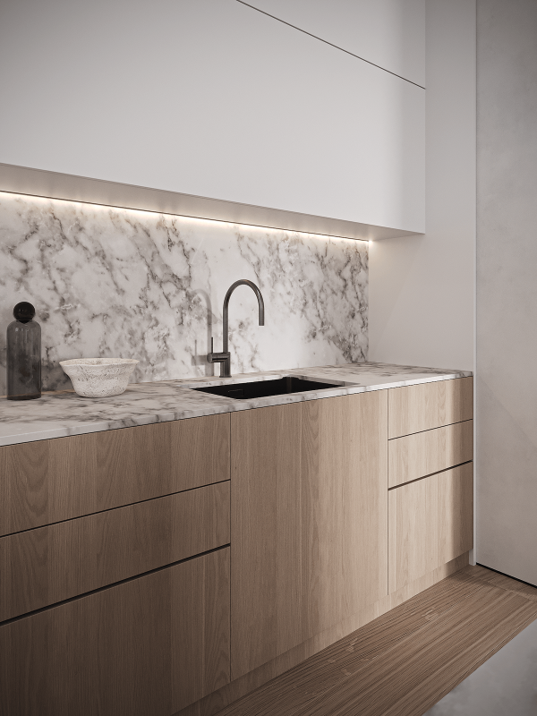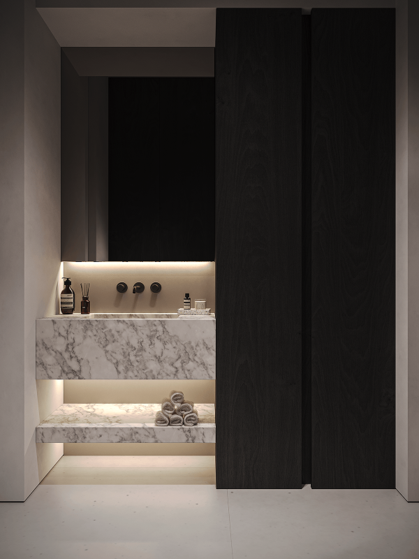 An LED ribbon calls attention to the edge of the light stone upstand, subtly defining it from the white wall.