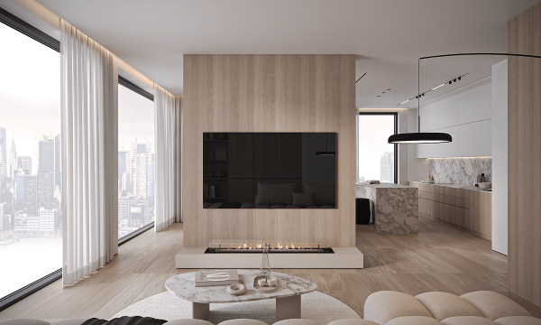 The TV wall is clad in matching light wood tone paneling to draw the eye through the open plan. A large wall-mounted TV is underlined by a long modern fireplace, which brings movement and light. Open doorways flank either side of the focal wall, offering an uninterrupted circuit around the living space.