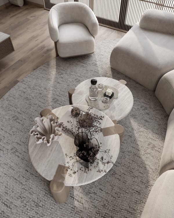 Round rugs define the lounge area and the dining zone with a light tone and texture.